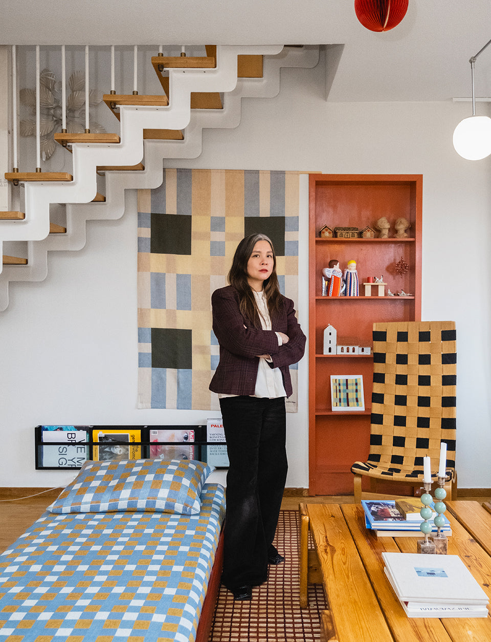 Evelinas verk är både ett statement och en inbjudan: vibrerande färger och knivskarpa geometriska former som känns levande, nästan arkitektoniska.