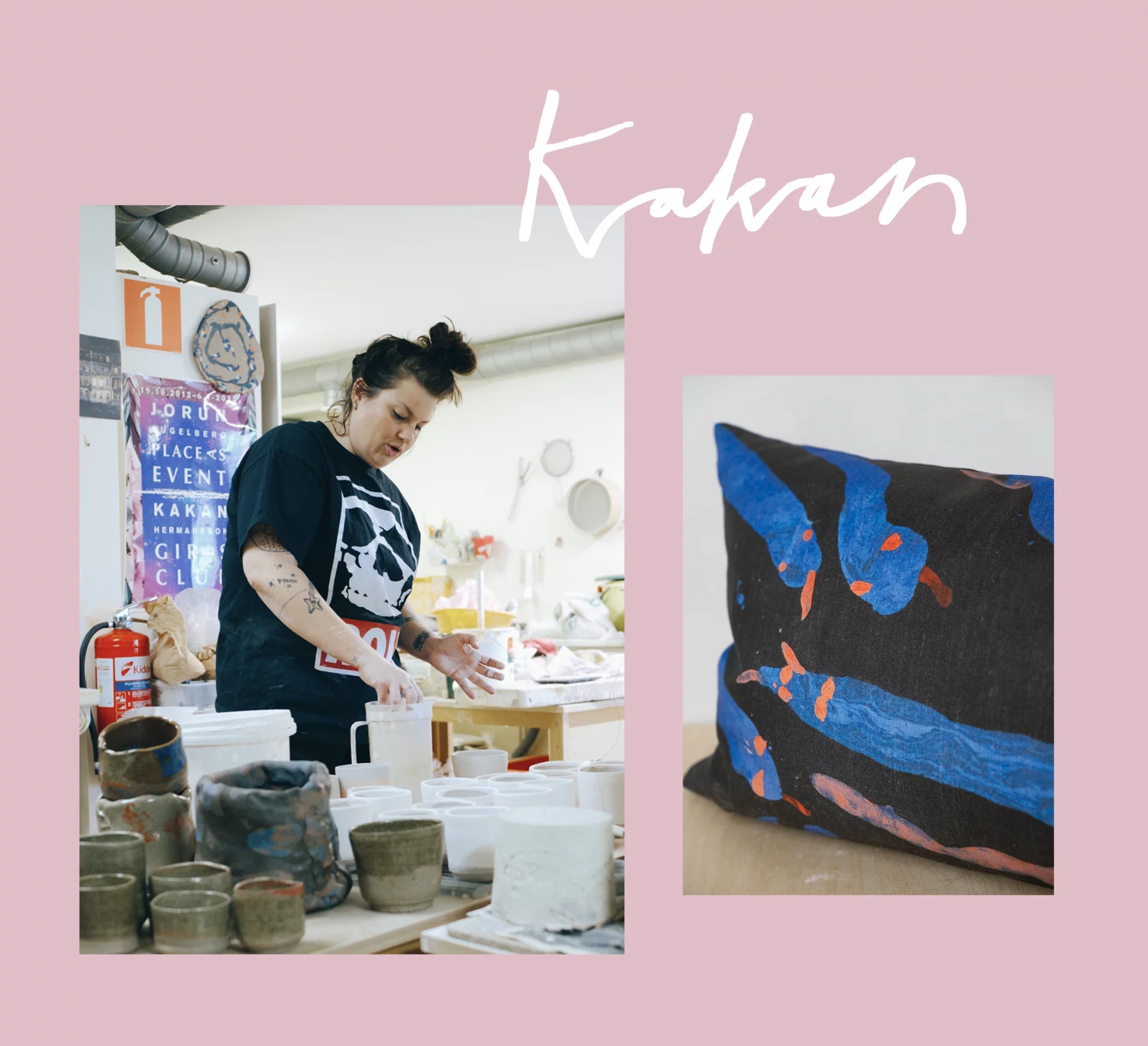 Solidaritet och antirasism genomsyrar multidisciplinära konstnären Karin Kakan Hermansson  särpräglade, älskvärda personlighet. Hon utforskar återkommande samband/associationer mellan hantverk, smak och social status. Verken är ofta kommentarer till ämnen som feminism, sexualitet, identitet och politik. “Alla har ett förhållande till hantverk.” Hermansson är född i Lund 1981 och bosatt i Stockholm sen 20 år. Hon är utbildad på Konstfack, keramik och glas 2006-2012, där hon undervisar som adjunkt sedan 9 år.
