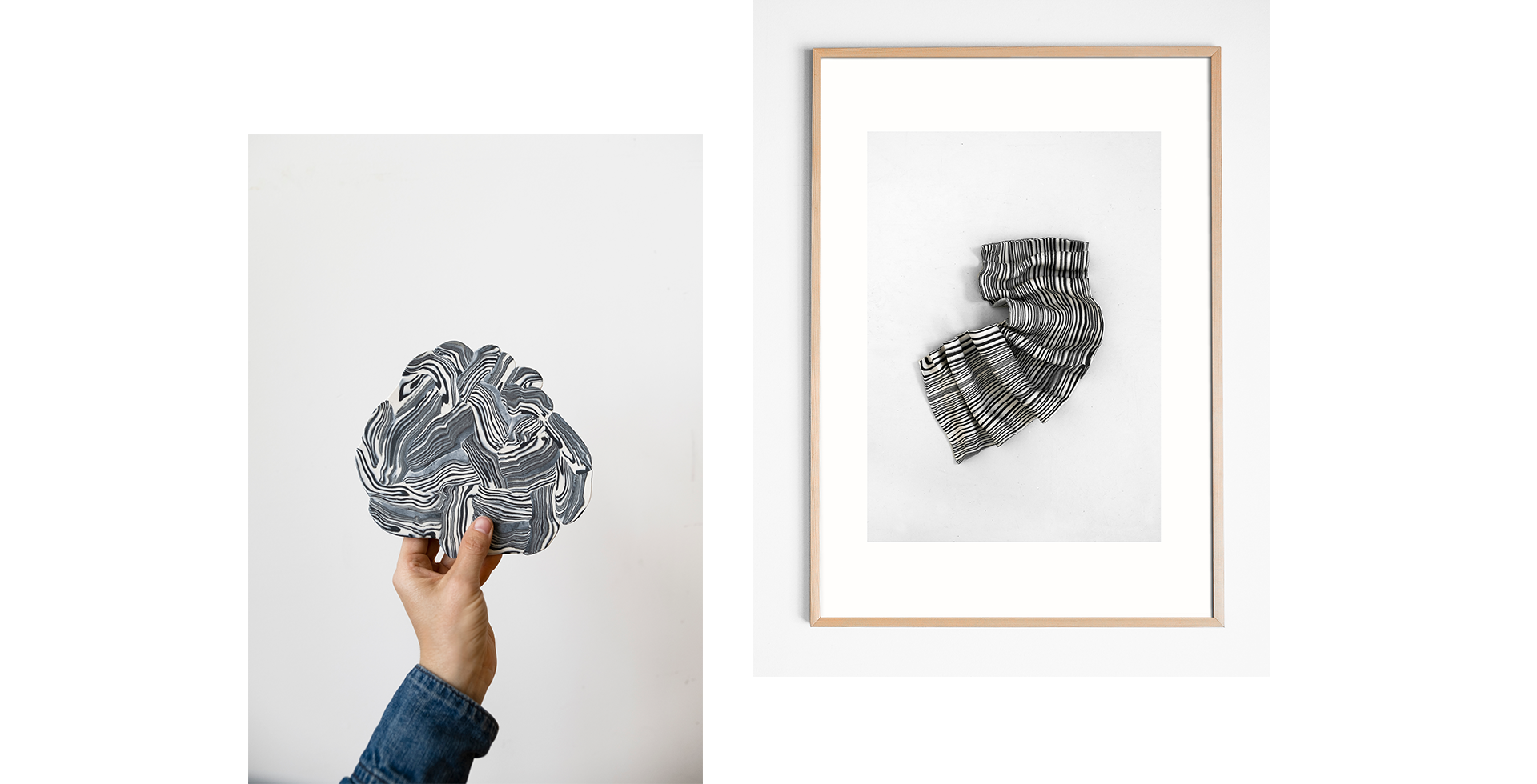 Diese Technik bietet unendliche Ausdrucksmöglichkeiten und Frida nutzt sie sowohl für Skulpturen als auch für Alltagsgegenstände. Ihre wunderschönen Muster mit farbigen Tonkombinationen wurden zu Postern für Fine Little Day.